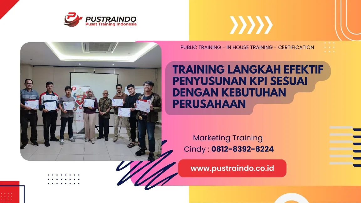 Langkah Efektif Penyusunan KPI (Key Performance Indicator) Sesuai dengan Kebutuhan Perusahaan menjadi sangat penting bagi manajer, team leader, dan profesional yang bertanggung jawab atas pengukuran kinerja individu maupun organisasi. KPI merupakan alat strategis untuk memonitor pencapaian tujuan bisnis, meningkatkan produktivitas, dan memastikan setiap aktivitas sejalan dengan visi dan misi perusahaan. Melalui training ini, peserta dibekali keterampilan dalam merancang KPI yang spesifik, terukur, relevan, dan realistis sesuai kebutuhan perusahaan. Peserta juga mempelajari teknik penentuan target kinerja, pemilihan indikator yang tepat, serta cara memantau dan mengevaluasi pencapaian KPI secara berkelanjutan. Kompetensi ini membantu perusahaan meningkatkan akuntabilitas, mendukung pengambilan keputusan berbasis data, serta mendorong motivasi dan kinerja tim secara optimal. Dengan penguasaan metode penyusunan KPI yang efektif, peserta mampu menciptakan sistem pengukuran kinerja yang transparan, objektif, dan adaptif terhadap dinamika bisnis, sehingga berkontribusi pada pertumbuhan dan keberhasilan perusahaan secara keseluruhan.