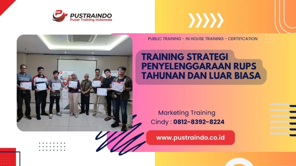 Training Strategi Penyelenggaraan Rapat Umum Pemegang Saham (RUPS) Tahunan dan Luar Biasa menjadi sangat penting bagi manajemen perusahaan, sekretaris perusahaan, dan pemangku kepentingan yang terlibat dalam tata kelola perusahaan. RUPS merupakan forum utama untuk mengambil keputusan strategis perusahaan, termasuk pengesahan laporan keuangan, penetapan dividen, perubahan anggaran dasar, dan kebijakan penting lainnya. Melalui training ini, peserta dibekali pemahaman mendalam mengenai prosedur hukum dan regulasi yang berlaku, tata cara persiapan dokumen, serta teknik pengelolaan agenda RUPS agar berjalan efektif, efisien, dan sesuai ketentuan. Selain itu, peserta juga mempelajari strategi komunikasi dengan pemegang saham, manajemen risiko dalam pengambilan keputusan, dan penanganan dinamika rapat. Kompetensi ini sangat krusial untuk memastikan RUPS terlaksana dengan tertib, meningkatkan akuntabilitas, serta memperkuat tata kelola dan reputasi perusahaan. Dengan penguasaan strategi dan praktik penyelenggaraan RUPS, perusahaan dapat mengoptimalkan partisipasi pemegang saham, meminimalkan konflik, dan mendukung pengambilan keputusan yang tepat untuk pertumbuhan dan keberlanjutan perusahaan.